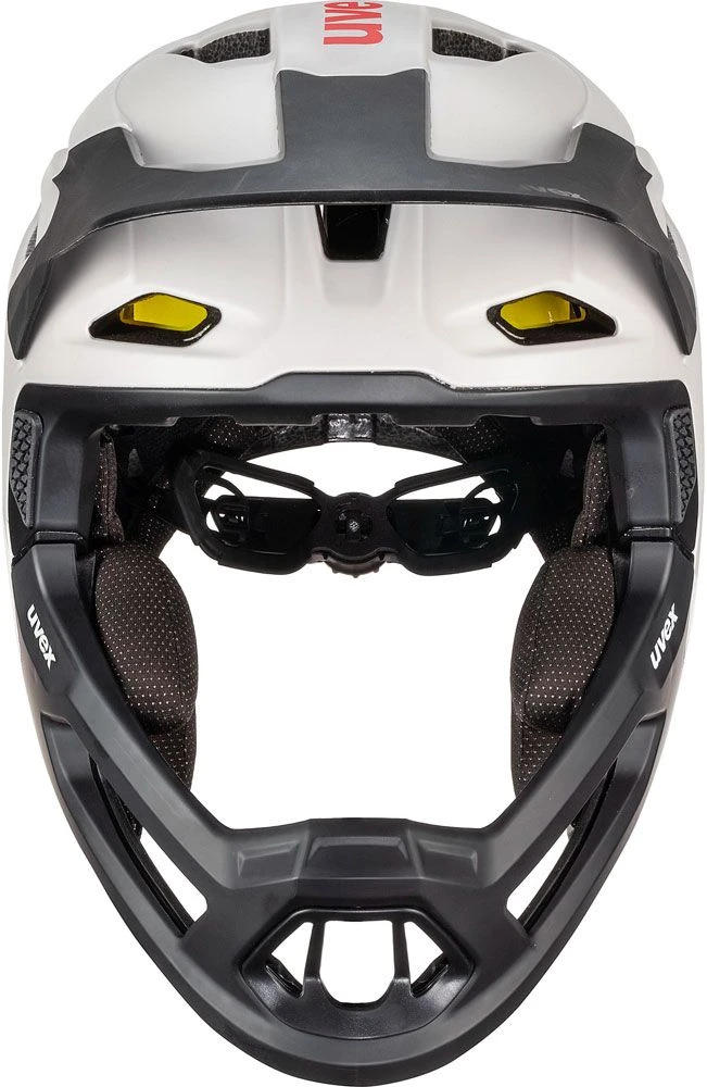 Uphill, downhill, flow trail, bike park: the uvex revolt is at home in any terrain. This is made possible by the innovative, one-hand removable chin bar. This allows the MTB helmet to be transformed from full-face to jet helmet and back again in seconds.