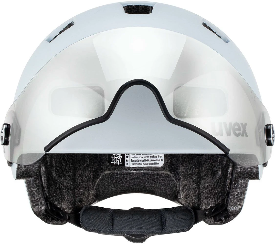 Additional protection in the urban jungle is provided by the deep-cut neck area. For better visibility at dusk, the uvex rush visor is equipped with a plug-in LED and reflective webbing and logos. The all-weather visor with extended field of vision in litemirror silver (Cat.1) optimally protects the eyes from sun, wind and other environmental influences in road traffic.